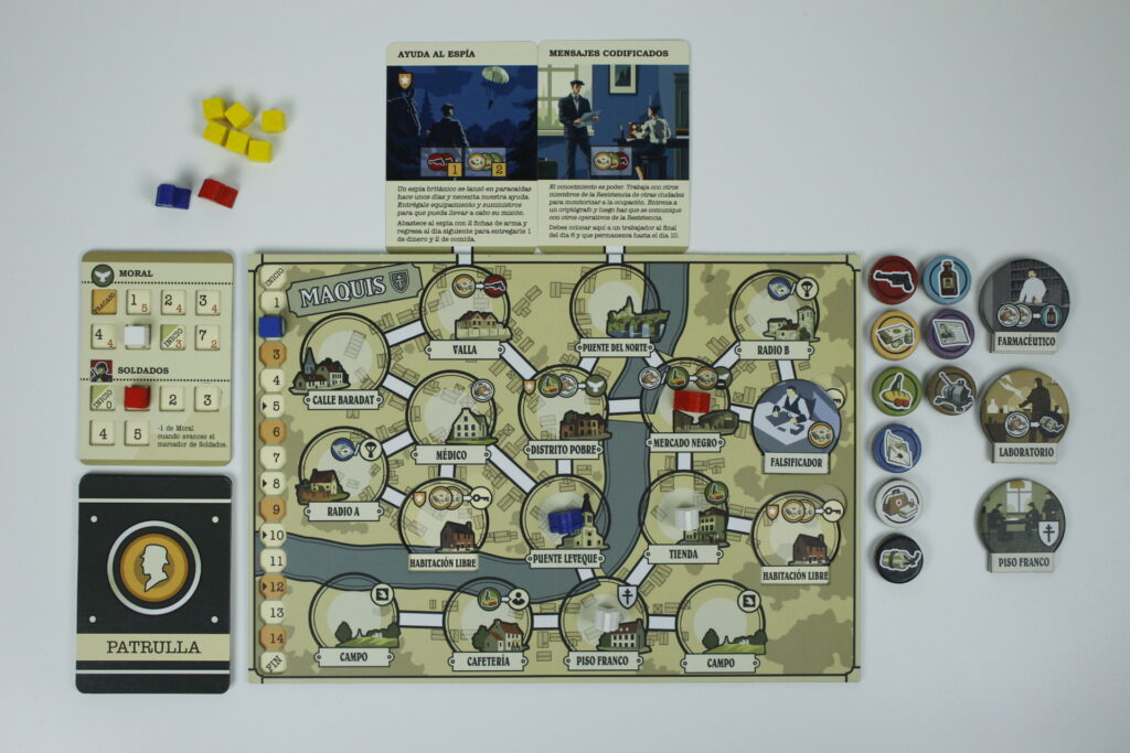 Maquis es un juego en solitario de colocación de trabajadores con diferentes objetivos y partidas de aproximadamente 20-30 minutos. Esta edición se corresponde con la Segunda Edición de Maquis, que incluye nuevo contenido (nuevas misiones, nuevos recursos y nuevas losetas de acción).